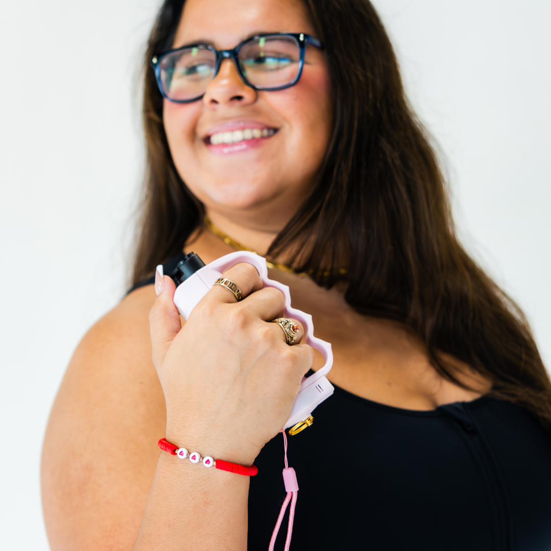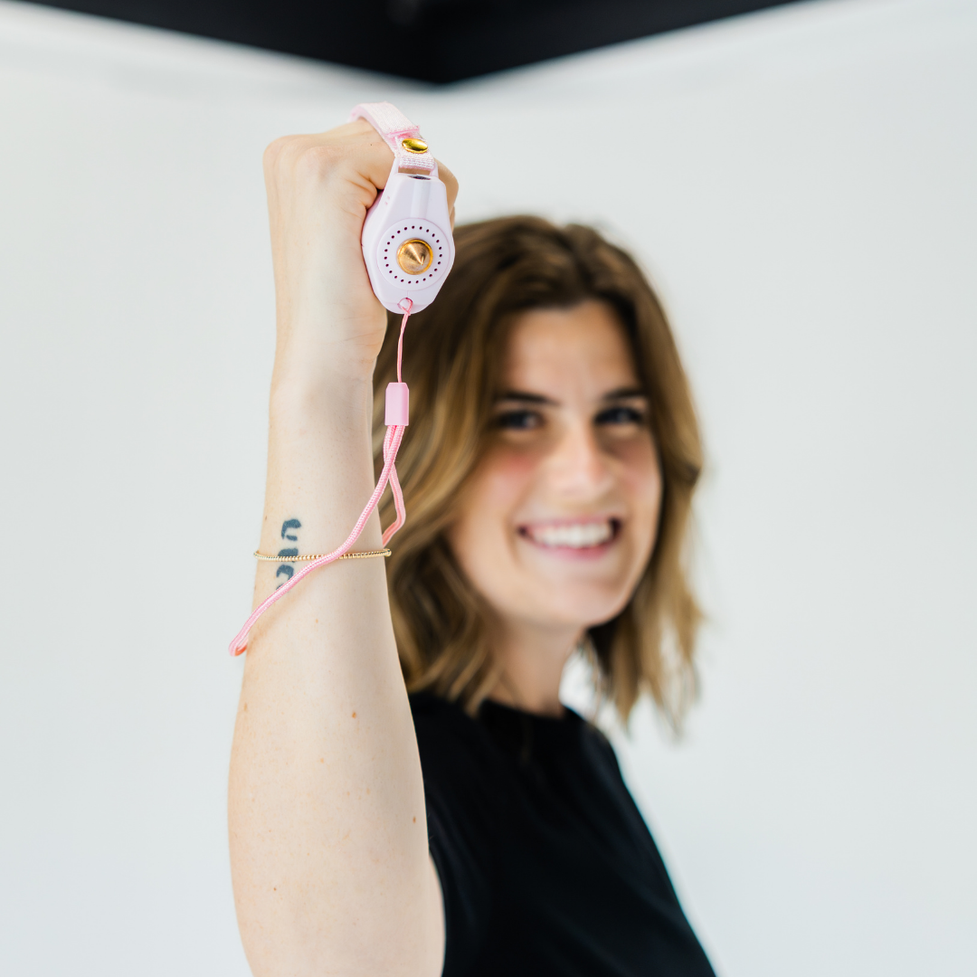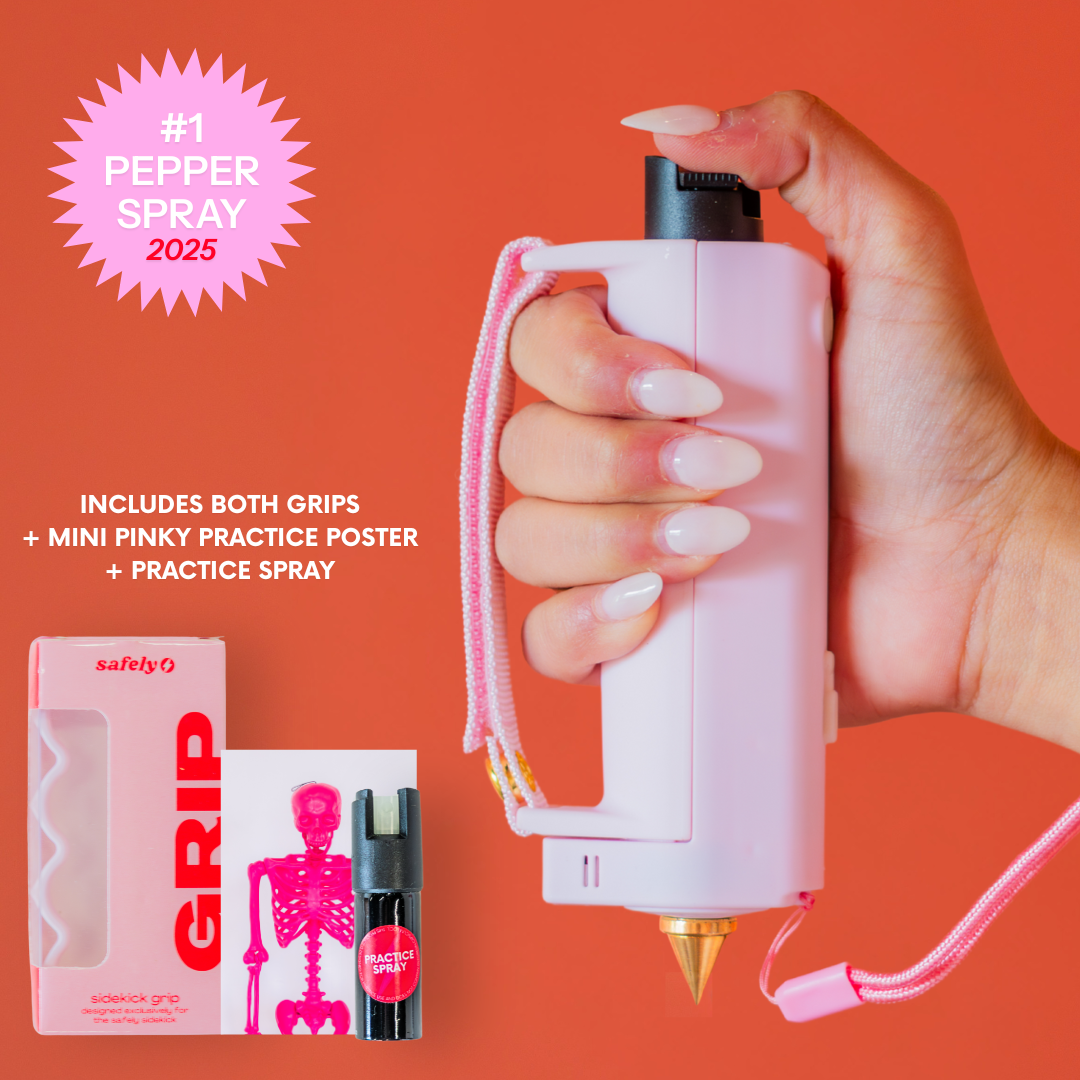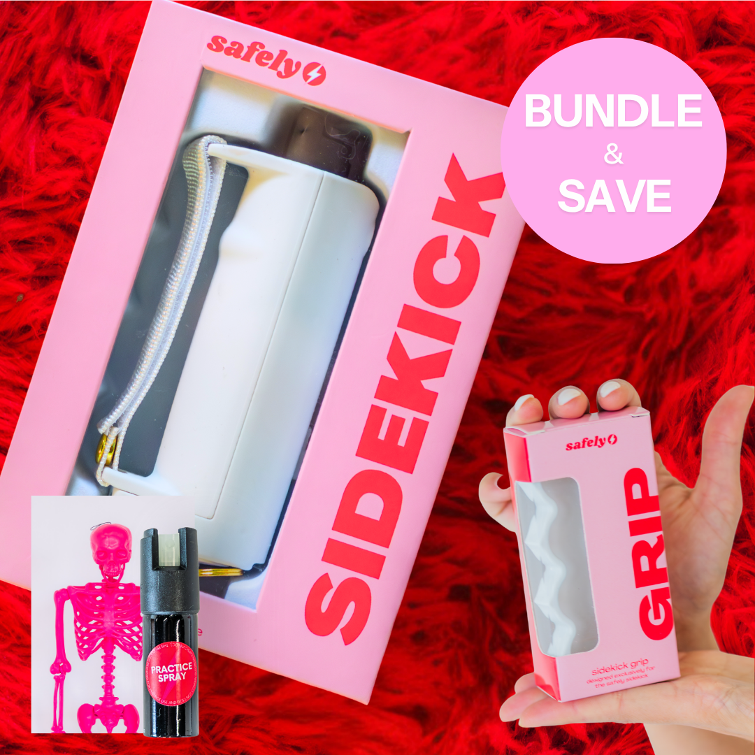 Equipped with a defense spray, flashlight, alarm, grip, keychain and safety spike, the Safely Sidekick has your back in more ways than one.