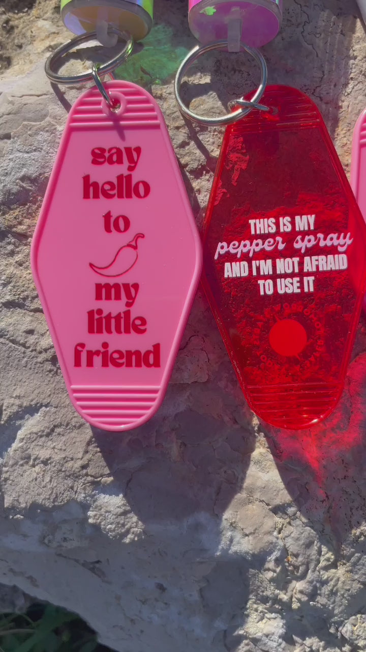 - the pepper spray & motel keychain are perfect items to attach to one another.