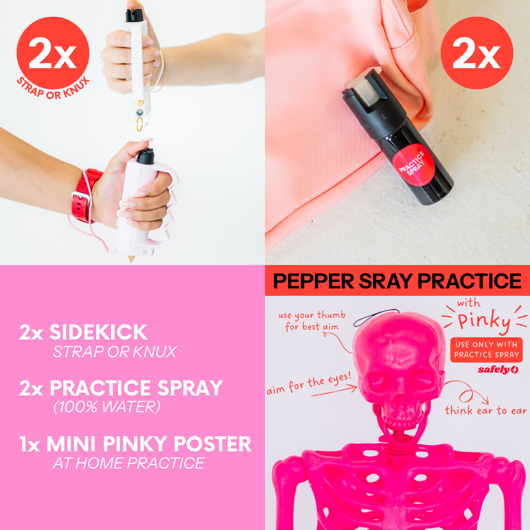 Every Sidekick includes your choice of pepper spray or dog spray, a flashlight, alarm, one grip, micro-USB charger, and both the keychain and safety spike attachments. Add-ons are optional and can be customized to fit your needs.