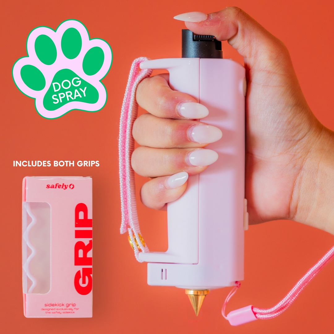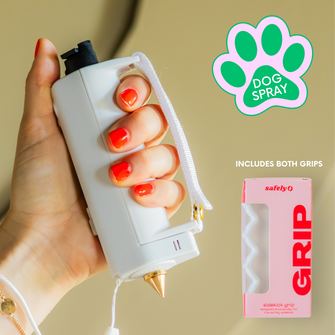Equipped with a defense spray, flashlight, alarm, grip, keychain and safety spike, the Safely Sidekick has your back in more ways than one.